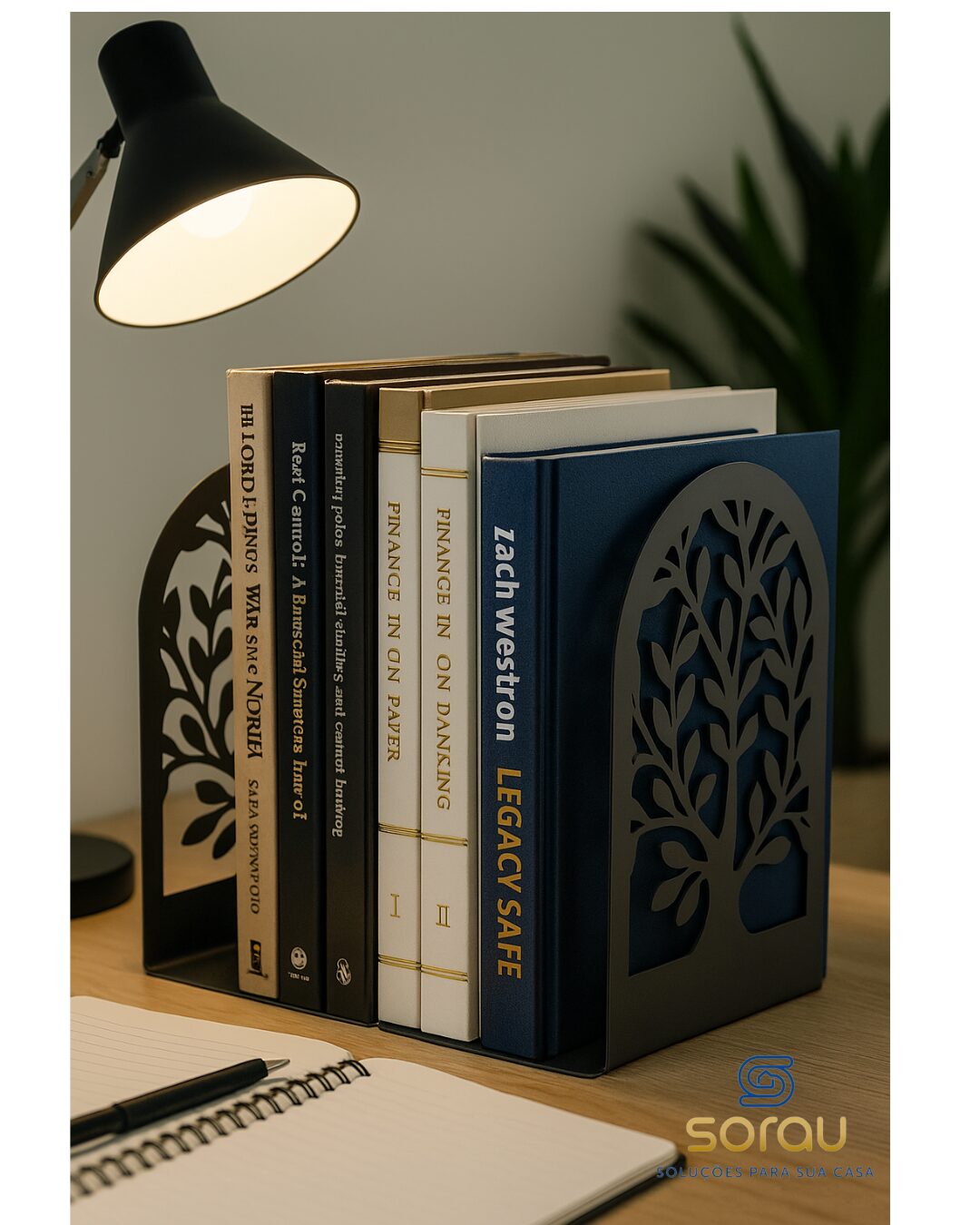 O destaque fica por conta do seu design vazado em forma de árvore, cujos galhos delicadamente entrelaçados formam uma silhueta charmosa e moderna. A base do suporte possui um formato em “L”, que proporciona estabilidade ao ser posicionado sob os livros, impedindo que escorreguem ou tombem. O corte preciso no metal cria uma estética visualmente leve, mesmo sendo uma peça robusta.